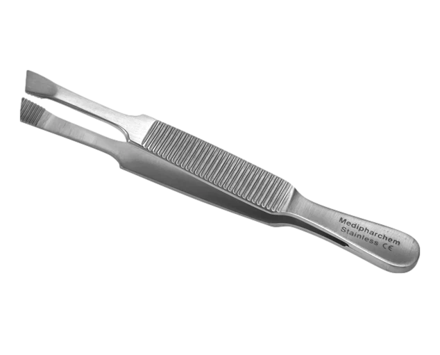 Epilationspinzette mit abgeschrägter breiter Spitze (5 mm). Ideal zum Entfernen aller Arten von Haaren, Stoppeln und Splittern. Edelstahl mattiert.