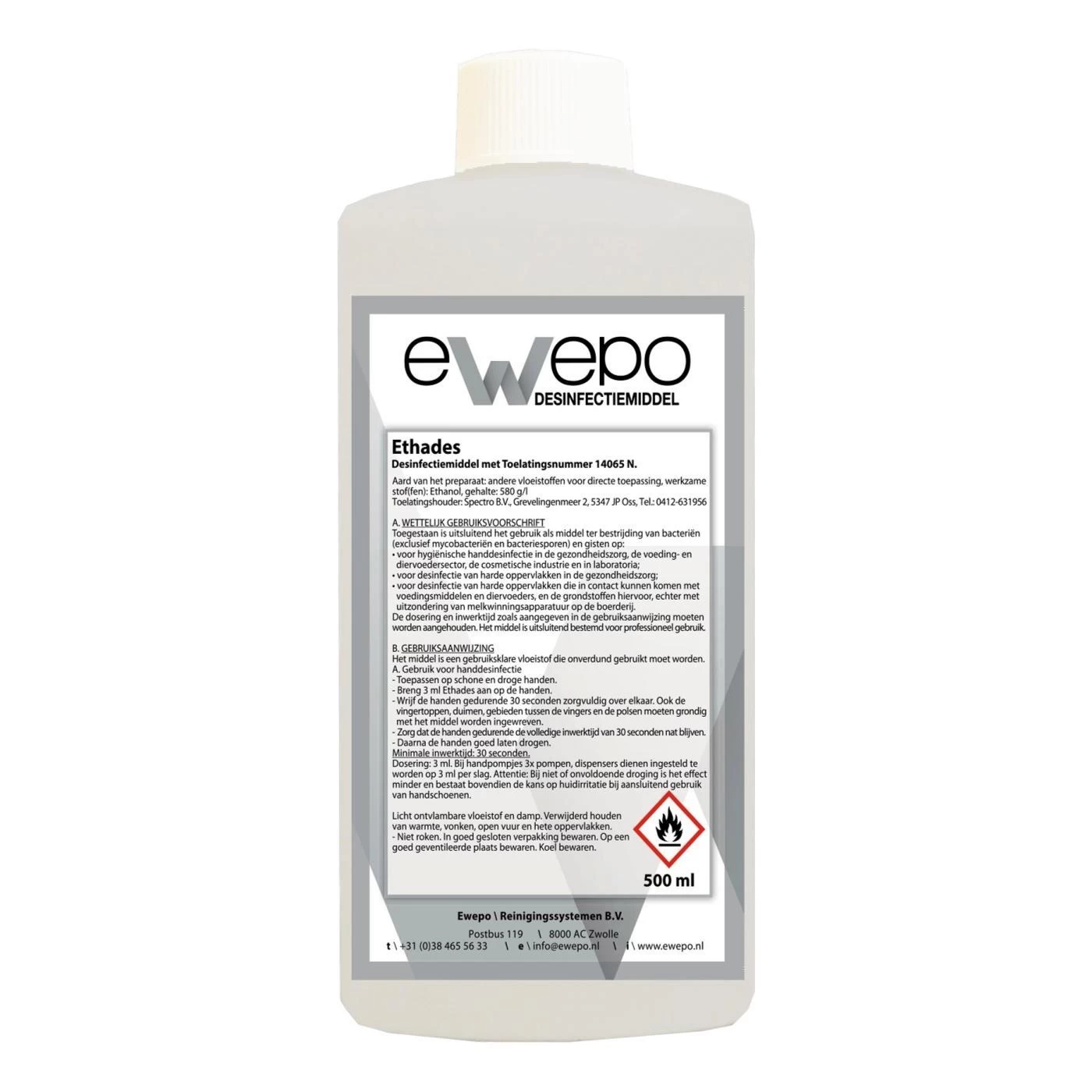 Ethades ist ein multifunktionales Produkt, das zur Desinfektion von Haut und Oberflächen geeignet ist. Ethades basiert auf reinstem Ethanol (70%) und trocknet streifenfrei auf. Ethades ist ein hautfreundliches Desinfektionsmittel auf Alkoholbasis. Biozide sicher verwenden. Vor Gebrauch Etikett und Produktinformationen lesen. Zugelassen unter der Nummer: 14065 N. A. RECHTLICHE ANWENDUNGSHINWEISE Nur die Verwendung als Hilfsmittel ist erlaubt zur Bekämpfung von Bakterien (ausgenommen Mykobakterien und Bakteriensporen) und Hefen: zur hygienischen Händedesinfektion im Gesundheitswesen. der Lebens- und Futtermittelbranche. die kosmetische Industrie und Labors; zur Desinfektion harter Oberflächen im Gesundheitswesen; zur Desinfektion von harten Oberflächen, die mit Lebens- und Futtermitteln in Kontakt kommen können. und die Rohstoffe dafür. jedoch ohne hofeigene Melkanlagen. Die in der Gebrauchsanweisung angegebene Dosierung und Einwirkzeit sind einzuhalten. Das Produkt ist nur für den professionellen Gebrauch bestimmt. Inhalt 500 ml