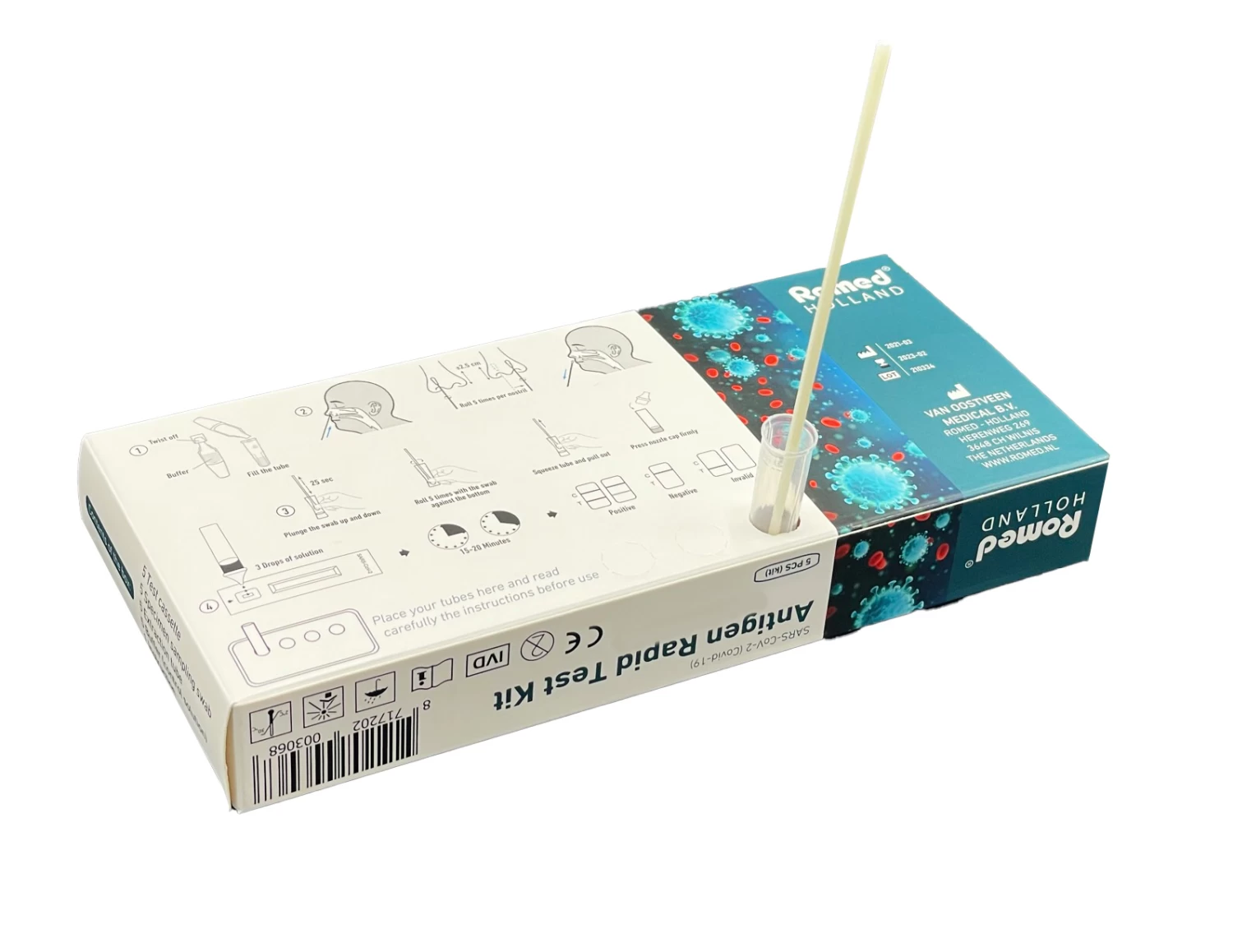 Der Romed SARS-CoV-2 Antigen-Schnelltest ist ein flacher Test zum Nachweis des Antigens von SARS-CoV-2 in menschlichen Nasenabstrichen.