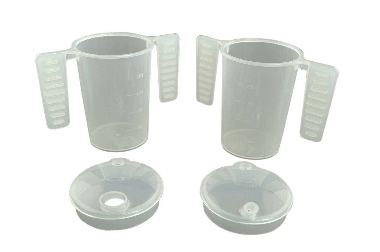 Dieser Trinkbecher hat lange und flache Henkel. Zwei Ausgussdeckel sind im Lieferumfang enthalten. Ein Deckel mit schmaler Öffnung und einer mit weiter Öffnung.