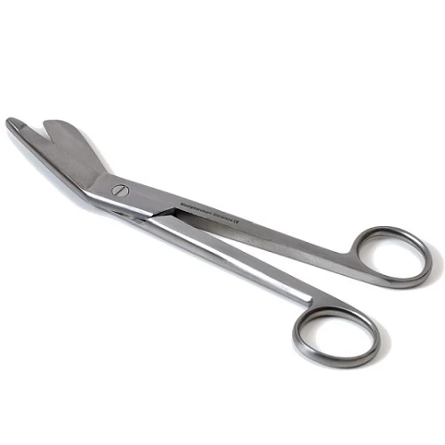 Die Scherenspitzen sind stumpf und einseitig mit einem zusätzlichen Schutz versehen, damit die Haut des Patienten beim Durchtrennen angelegter Verbände nicht verletzt werden kann. Die Schere ist aus mattiertem Edelstahl.